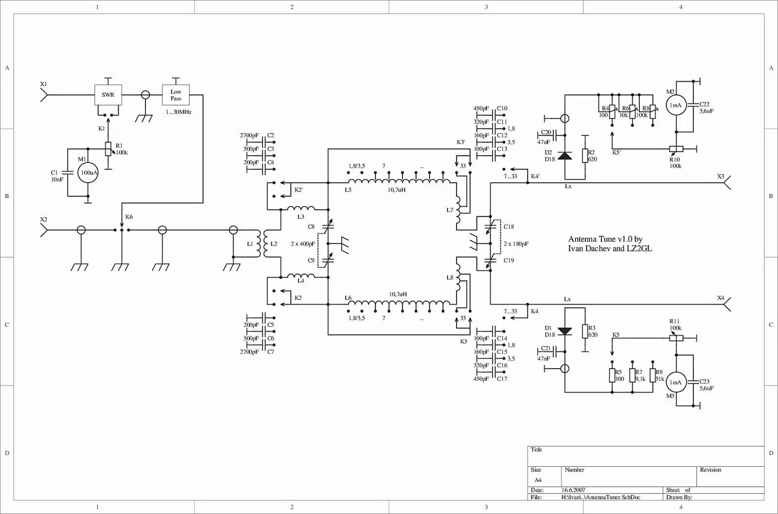 Inductors L3 and L4 serve as compensation coils, utilized exclusively for 1.8MHz and 3.5MHz bands to increase the input transformer’s inductance. These inductors can be air-wound or constructed using PVC forms. For 1.8MHz and 3.5MHz band operation, we utilize the combined inductance of L5 and L6. The tuner’s efficiency varies by frequency: 93% at 1.8MHz, 95% at 3.5MHz, and 98% across the 7MHz to 32MHz range. These measurements were taken with 1W input power at 50Ω, with efficiency calculated as the percentage of power delivered to a 600Ω load.