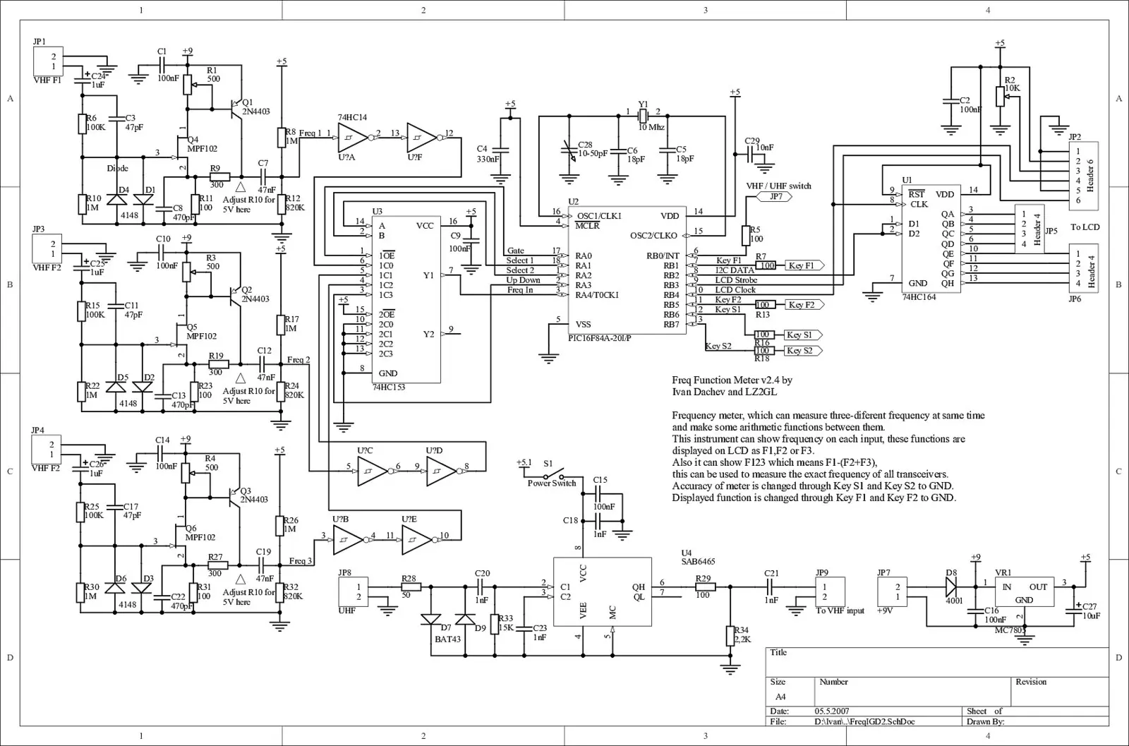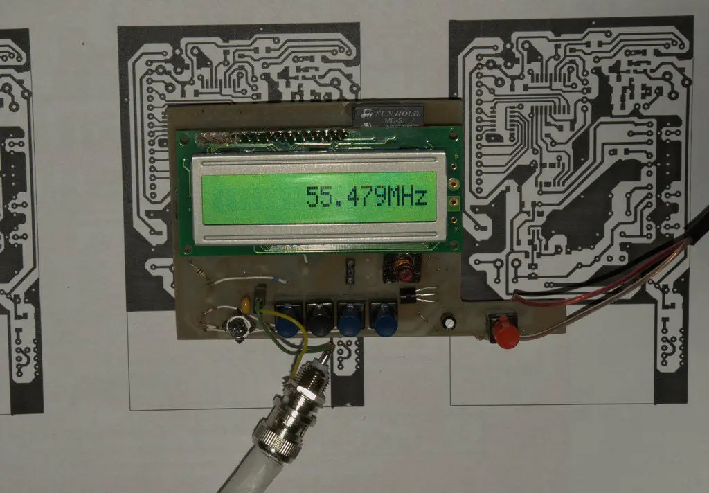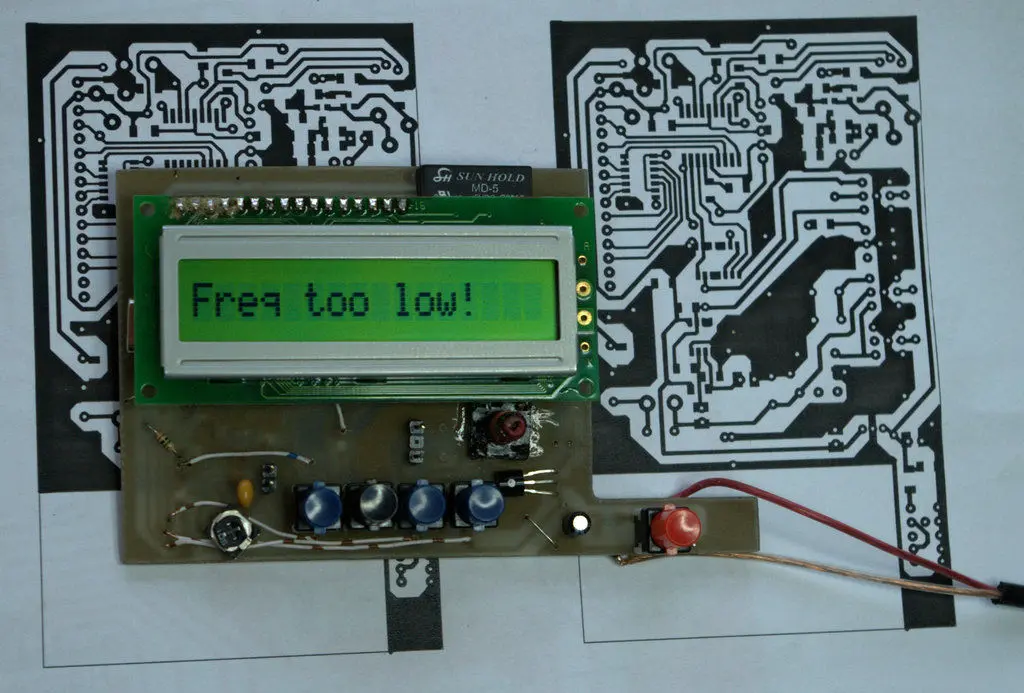 We developed the program ourselves, incorporating the necessary frequency meter calculations. The implementation required floating-point operations using Microchip AN575, which significantly increased the code size, reaching the 1KB code page limit of the PIC16F84. Consequently, we switched to the PIC16F88 (PIC16F628/648), which maintained pin compatibility for core functions while providing sufficient memory.