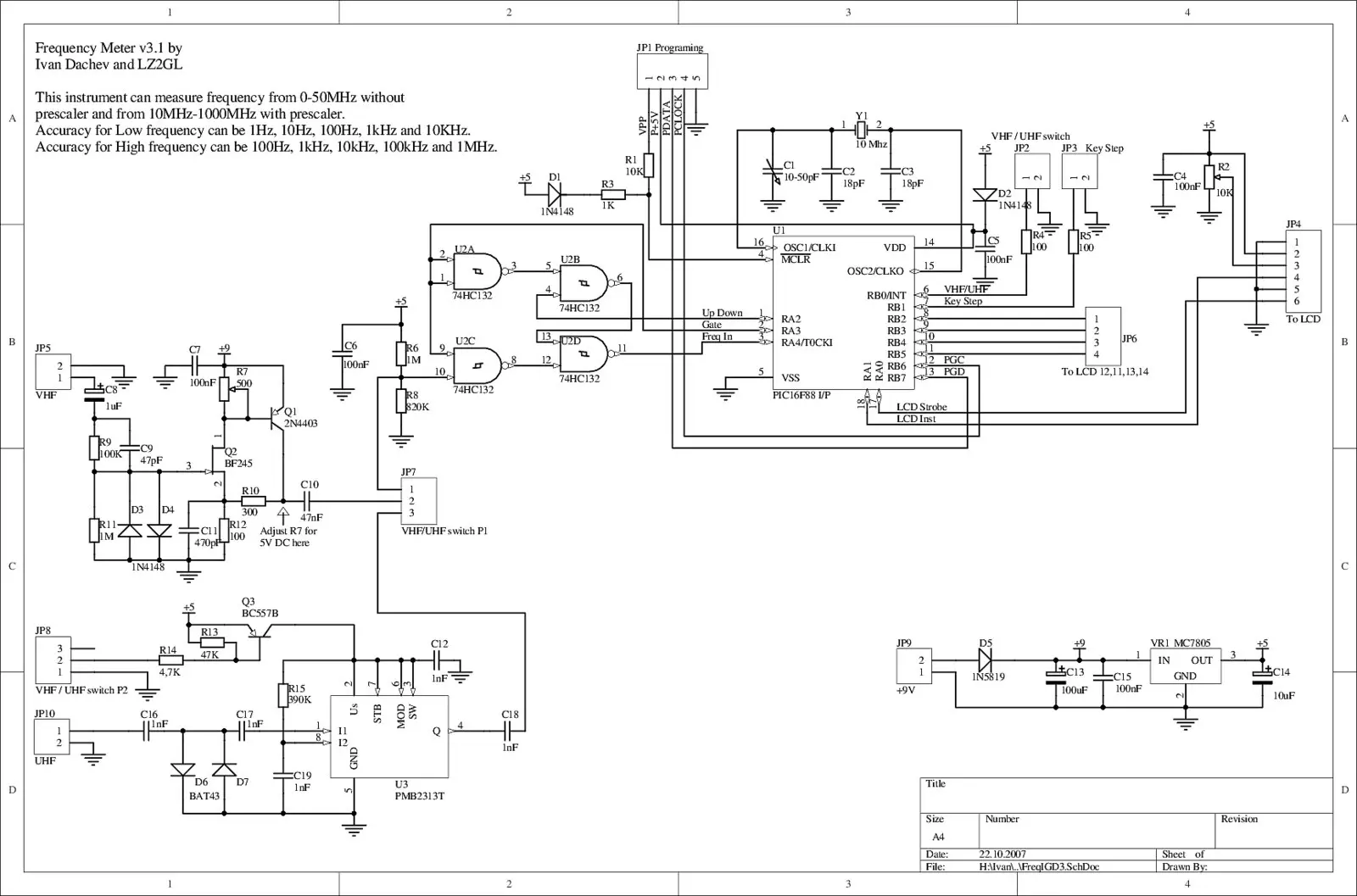 In 2007, we upgraded the frequency meter to version 3.1. We eliminated the 74HC164 to reduce power consumption and implemented a 4-bit interface for the LCD. We also modified the current divider and began using PMB2313T for high-frequency input. This divider, in SMD format, provides excellent performance in the 50MHz-1.1GHz range. We redesigned the PCB to fit a smaller enclosure and adopted SMD format for most components.