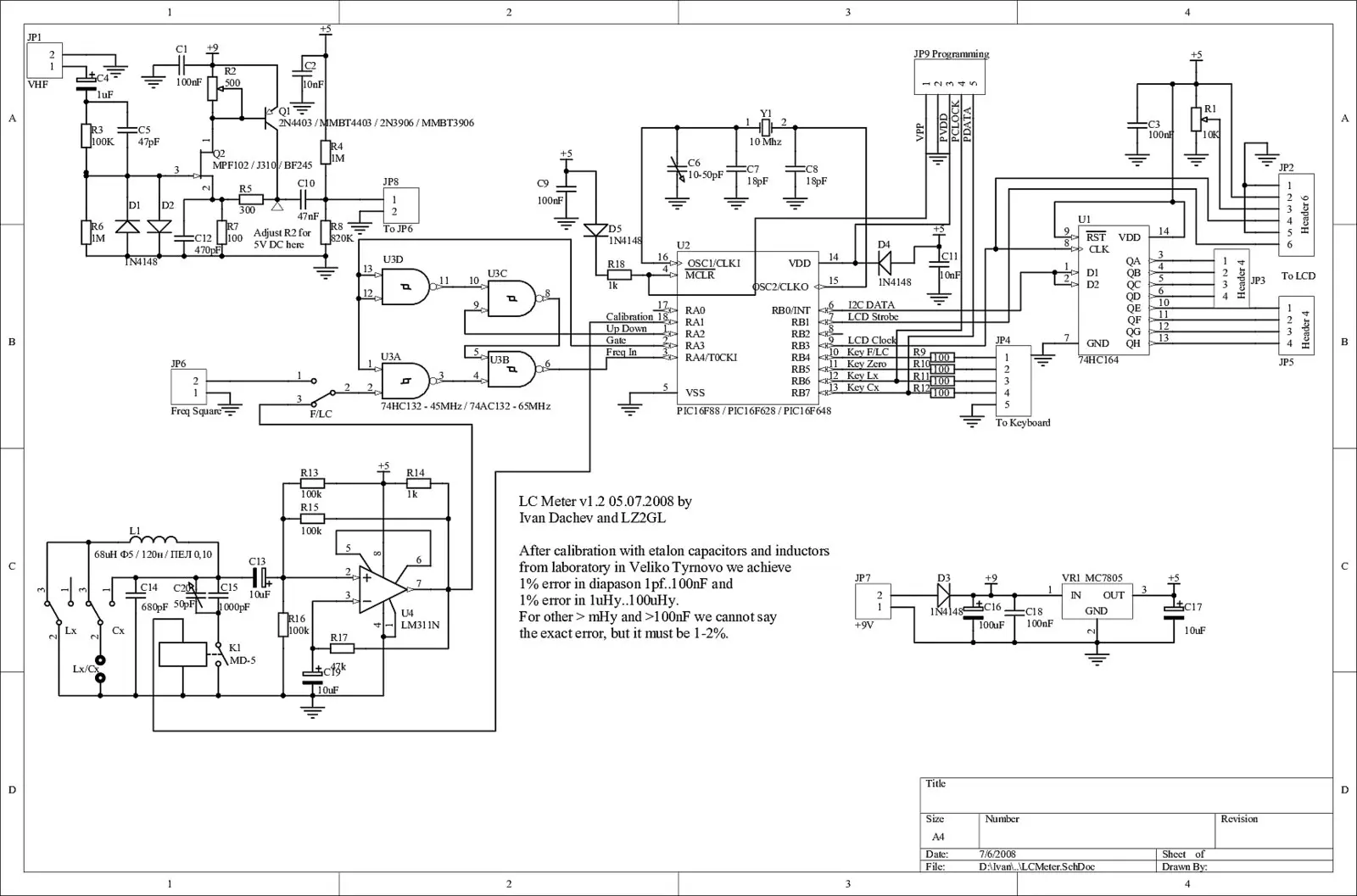 While the device could potentially be built with a PIC16F84 by removing the frequency meter function to reduce code size and retaining only LC measurement capabilities, we discovered that the older processor was actually more expensive than the newer PIC16F88. This price disparity arose because Microchip’s newer manufacturing technology reduced production costs, while demand for the older model drove up its price. Therefore, it made more sense to use the newer models, which offered more features, memory, and improved frequency measurement sensitivity.