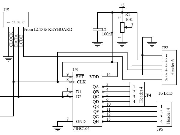 The design utilizes a 74HC164 8-bit serial-to-parallel shift register to minimize I/O pin usage.